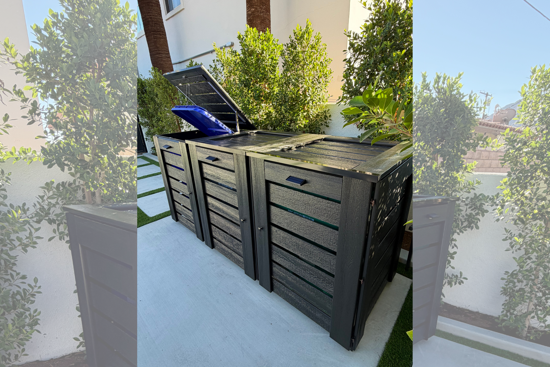 Our box for 3 trash cans weighs around 290 pounds, making it heavy enough to stay stable and secure. It’s not rated for strong winds, but it’s built to stand firmly in place under normal weather conditions.