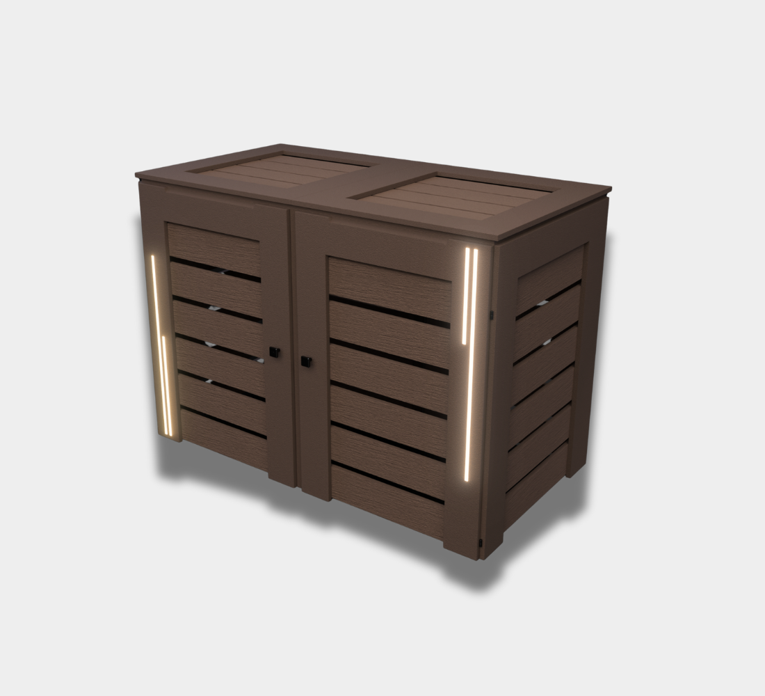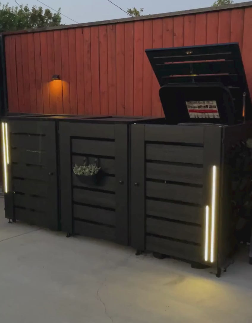 Our box for 3 trash cans weighs around 240 pounds, making it heavy enough to stay stable and secure. It’s not rated for strong winds, but it’s built to stand firmly in place under normal weather conditions.