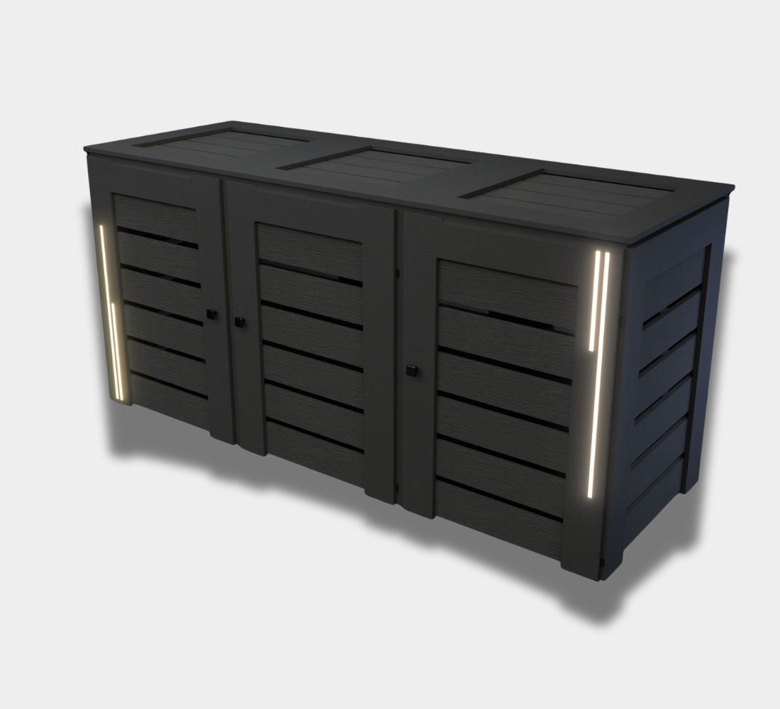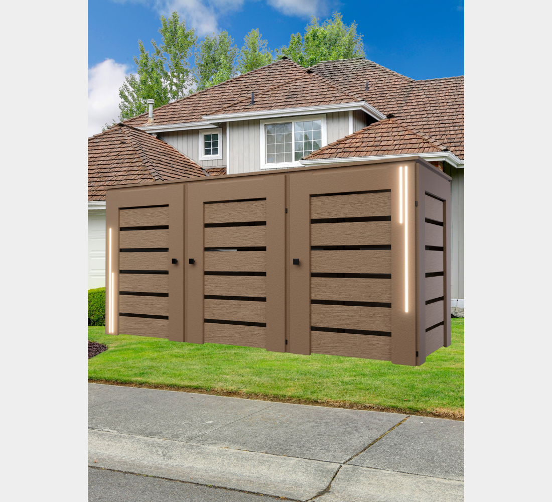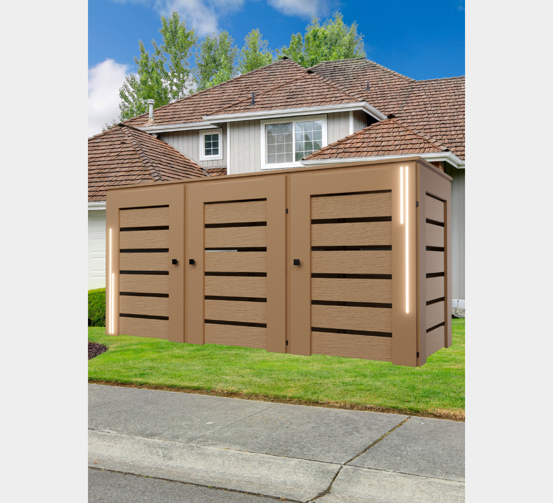 Our box for 3 trash cans weighs around 240 pounds, making it heavy enough to stay stable and secure. It’s not rated for strong winds, but it’s built to stand firmly in place under normal weather conditions.